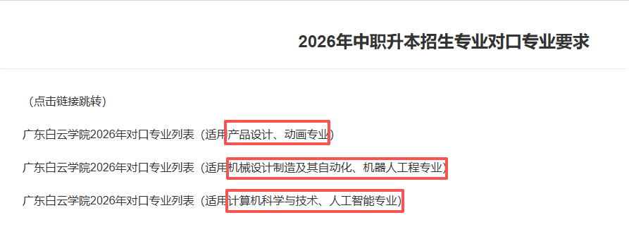 广东白云学院正在学校官网发布了2026年中职升本招生专业对口专业要求,共6个专业招生,别离是产物设想、动画、机械设想制制及其从动化、机械人工程、计较机科学取手艺、人工智能专业,本年没有新增专业。